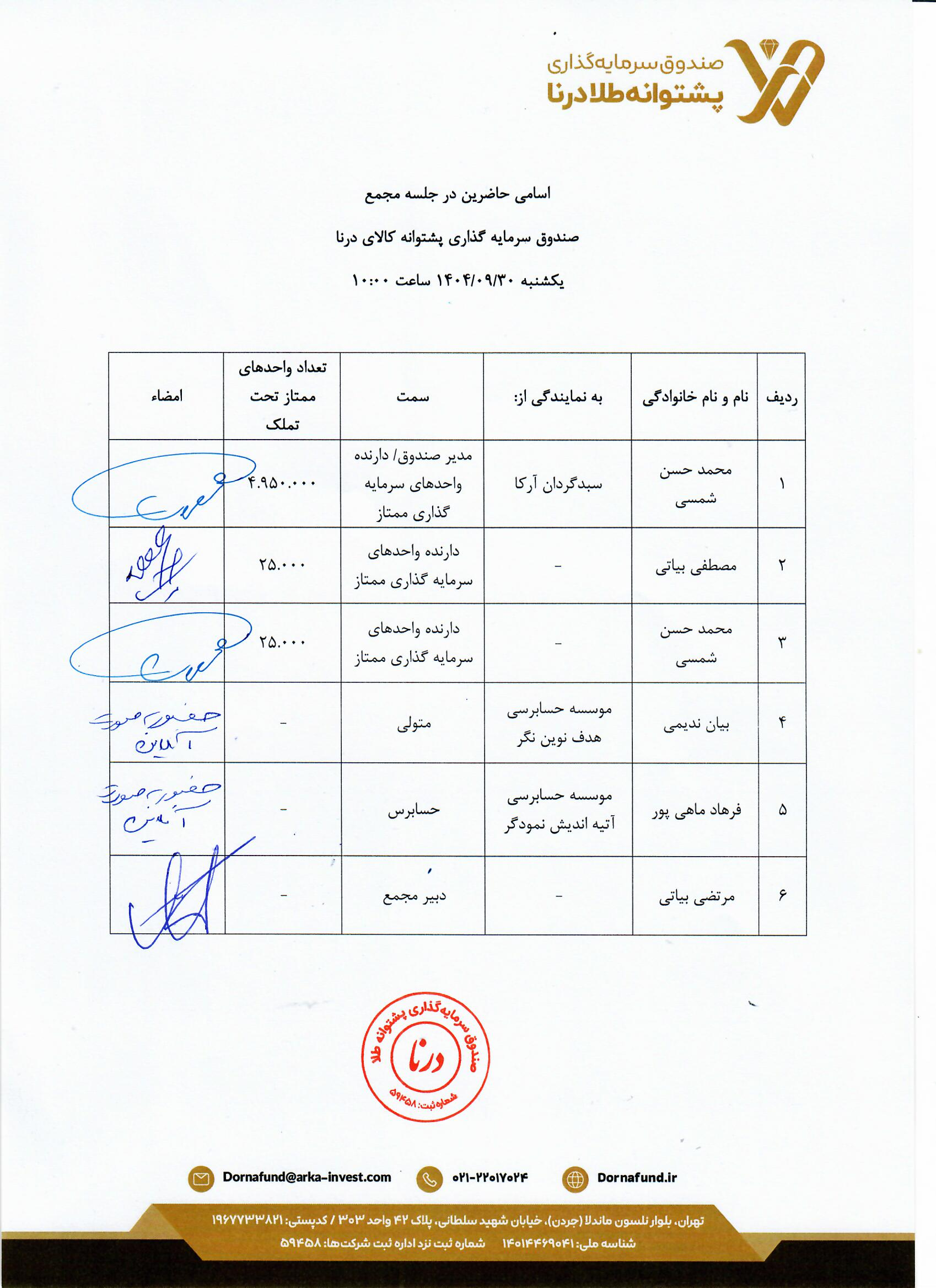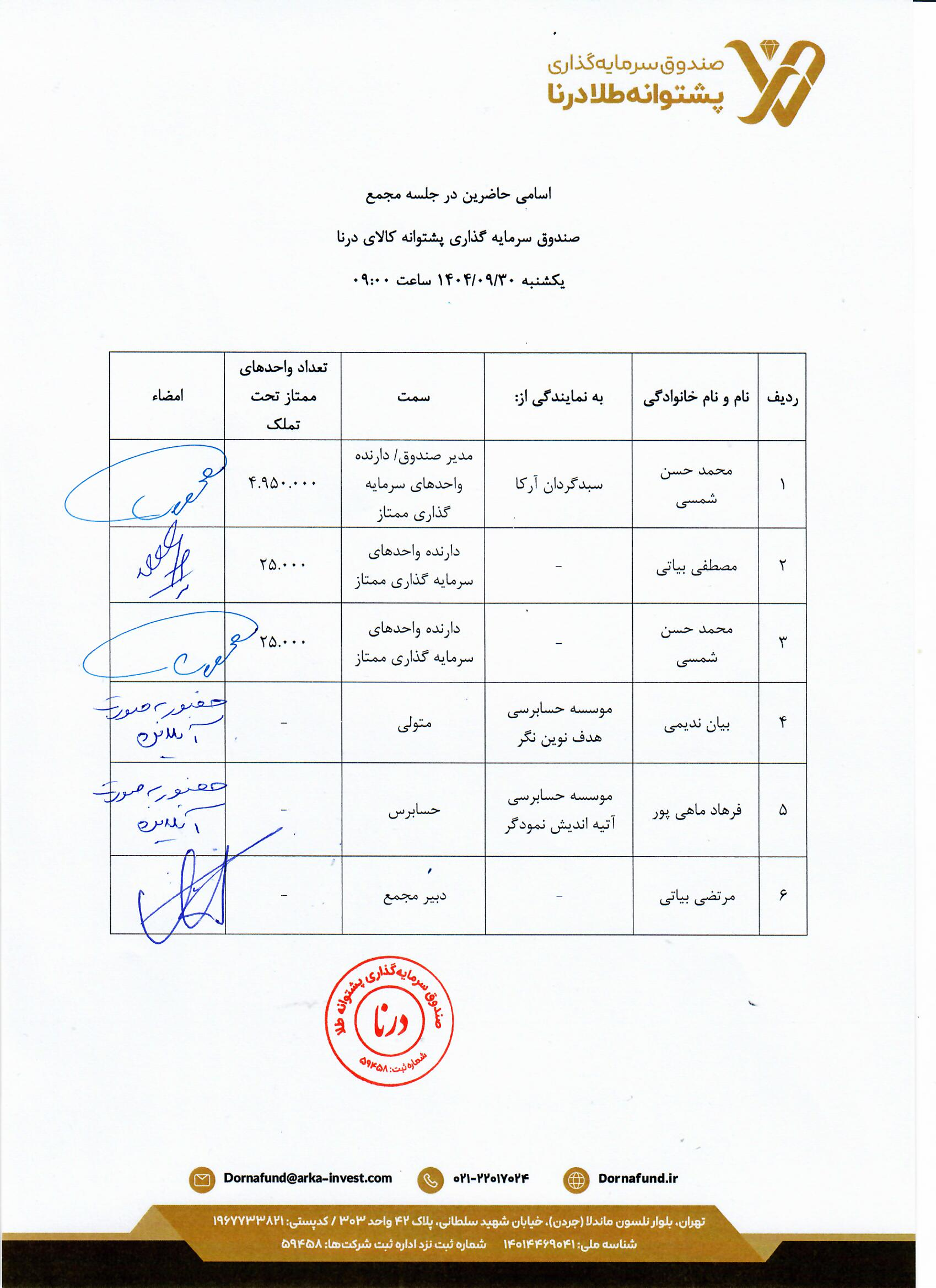 5 اسامی حاضرین در مجمع تغییر اساسنامه صندوق مورخ1404/11/12 ۱۴۰۴/۱۱/۱۲